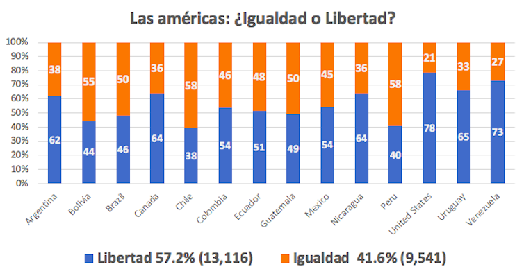 En los otros ocho países latinoamericanos donde se aplica la encuesta World Values Survey (WVS) se antepone la libertad sobre la igualdad, incluyendo el llamativo caso de Venezuela, donde la relación es 3 a 1.