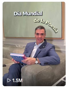 Ahora que el Ministro de Transportes Oscar Puente le está enseñando a manejar la redes (las de transporte no, que no sabe), las redes sociales, pues ahí tenemos al guapo Presidente Sánchez tiktokeando, dándole al Instagram, tuiteando en X a troche y moche, haciendo lo que hacen los influencers, hablar de lo que no saben, anunciar cosas que no valen para nada, influir en lo que no tiene importancia alguna. Y es que por lo que parece, le hizo caso a uno de esos 609 asesores, y al especialista en redes del Consejo de Ministros, para utilizar las redes para elevar su maltrecho índice de popularidad, y así parecer cercano al ciudadano, que no le soporta. Dime de que presumes…